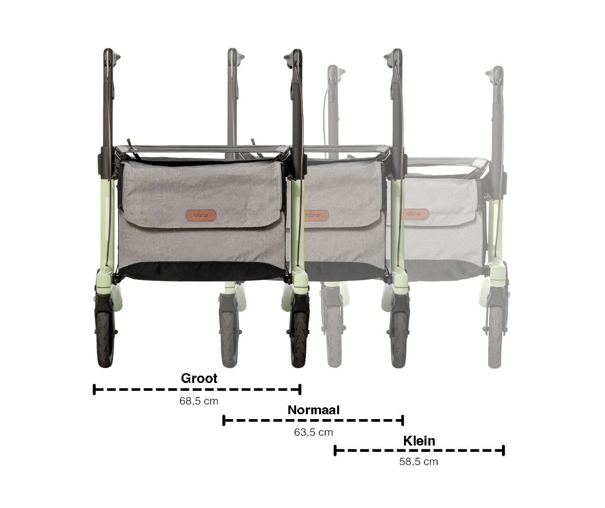 De Rollz Air is verkrijgbaar in twee maten: klein en normaal. Het verschil zit in de hoogte van het frame en de handgrepen. De kleine maat is geschikt voor gebruikers met een lengte van ongeveer 1,35 tot 1,60 meter. De normale maat past bij mensen tussen 1,60 en 2,00 meter. Twijfel je? Kies dan de maat waarbij je bij het lopen rechtop kunt staan met je armen in een ontspannen houding. Je kunt de handvatten eenvoudig in hoogte verstellen voor een optimale loophouding.